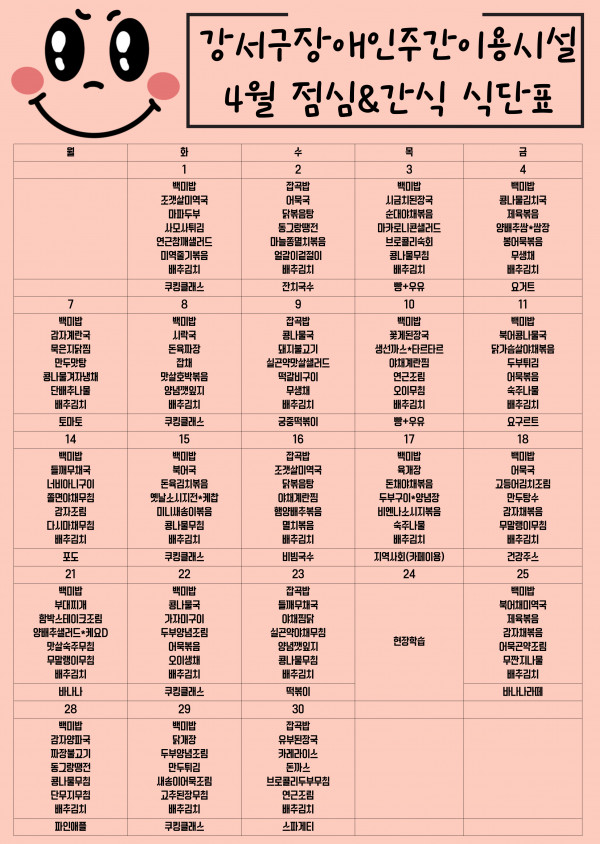 25년 4월 중식&간식 식단표 페이지 정보 작성일 25-03-31 13:09 본문 25년 4월 중식&간식 식단표입니다. 목록 이전글25년 5월 중식&간식 25.05.02 다음글25년 3월 중식&간식 식단표 25.03.04
