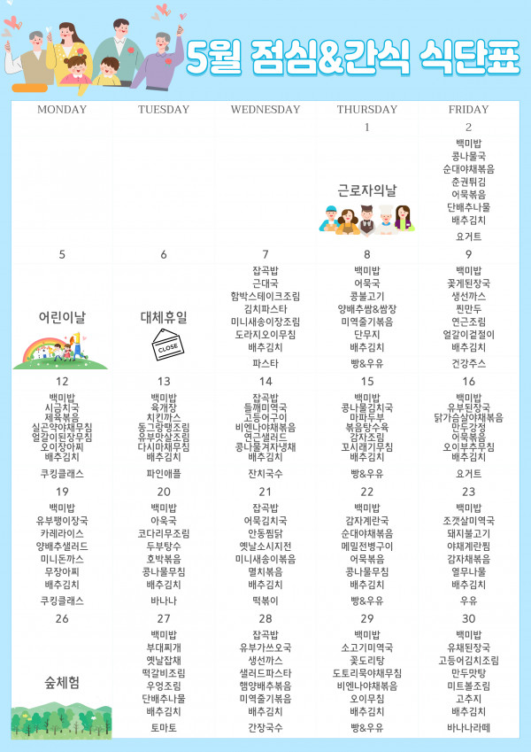 25년 5월 중식&간식 페이지 정보 작성일 25-05-02 09:13 본문 25년 5월 중식&간식 식단표입니다. 목록 이전글25년 6월 중식&간식 식단표 25.05.29 다음글25년 4월 중식&간식 식단표 25.03.31